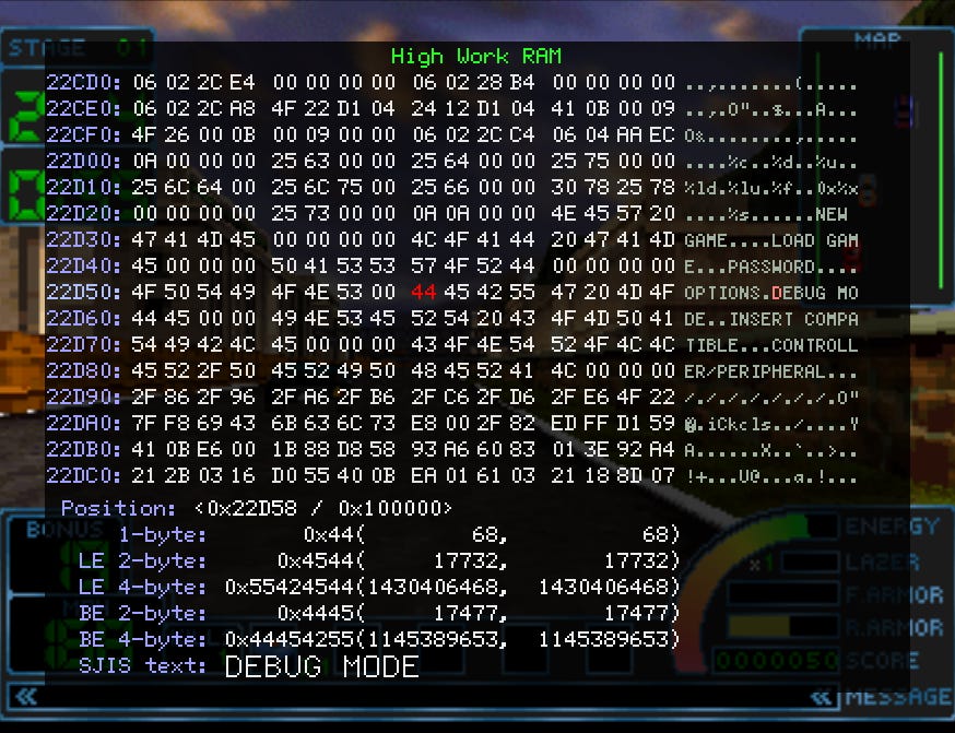 It’s helpful when games use fonts to render ASCII text, rather than representing text in graphics. You can just search the binary for interesting strings like DEBUG MODE.