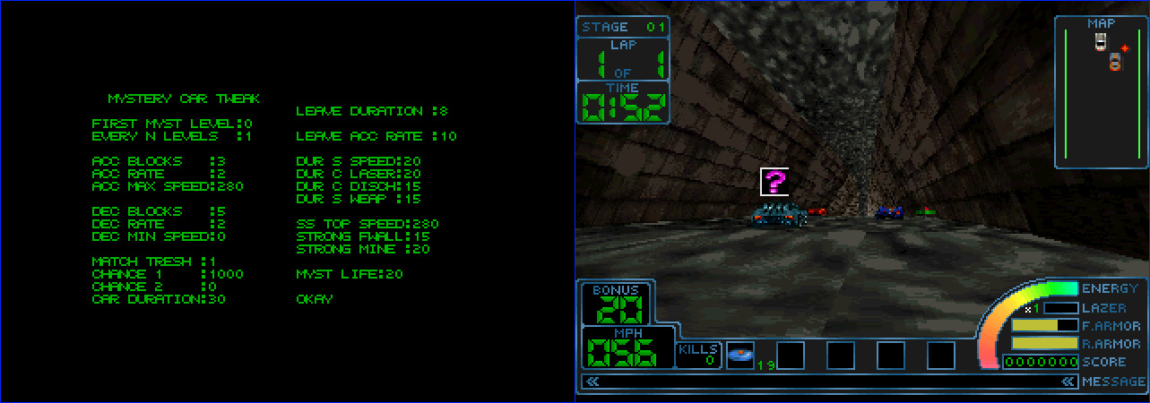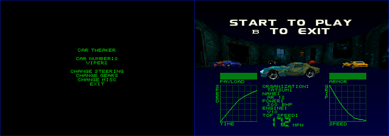 Interestingly, the cars in the Debug menu have different names from the rest of the game. The first one is called VIPER2 in the menu and AR. 12 on the select screen.