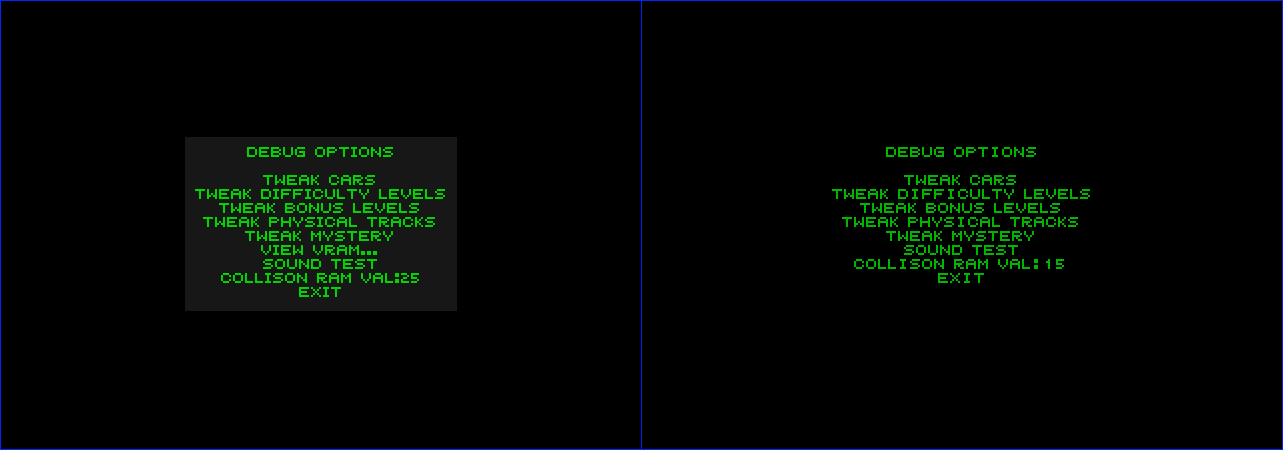 In Impact Racing, there’s a reference to the DEBUG MODE string at 0607b99c. It’s just after the other strings for the mode select menu: