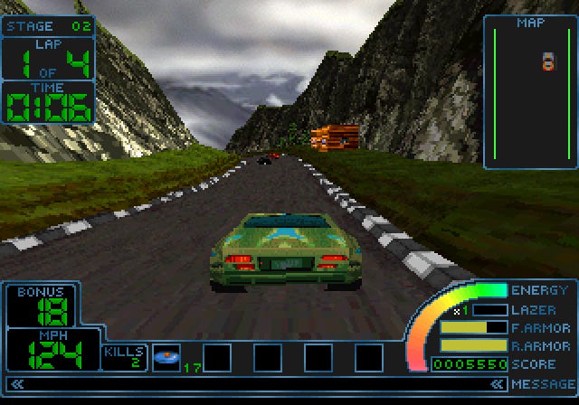 Impact Racing is a combination racing / combat game from Funcom Dublin. It came out for the PlayStation and Saturn in 1996. It’s reasonably competent, I guess, but is it anybody’s favorite game?