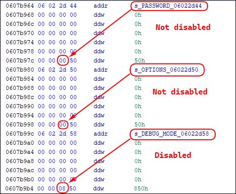 NEW GAME, LOAD GAME, PASSWORD, and OPTIONS all have an associated 0050 parameter. DEBUG MODE has 0850. The 08 seems to be a disable flag: if we change it to match the other strings…