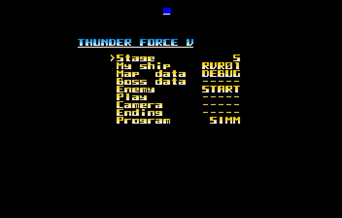 There’s a debug menu in this build that’s not in the final version. Its entry point is at 0602e92a. I couldn’t get it to actually function, but this is what it looks like:
