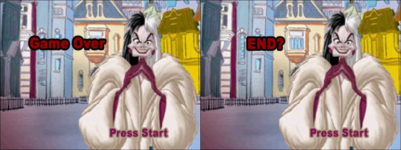 Even though they never change, Dora does have a health level and lives count. What happens if you injure her manually? You get Cruella De Vil!