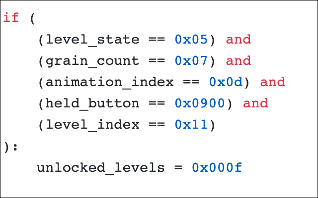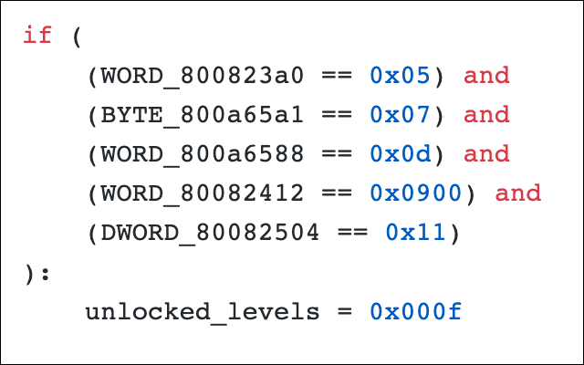 That is, if a bunch of conditions are met, all levels unlock. I tracked down each of the condition addresses shown to see what they store, mostly by watching how they change in the debugger: