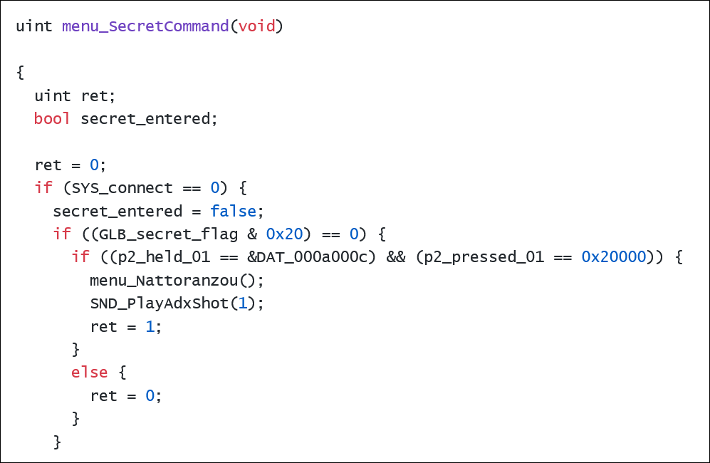 The function menu_SecretCommand executes when you're on the main menu. After filling in some of the labels from the symbol table, Ghidra's decompilation of it looks like this: