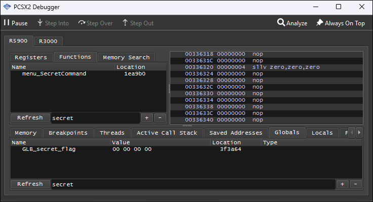 Aero Elite: Combat Academy's game data has debug symbols, which makes hunting for secrets much easier than it would be otherwise. Here’s a view of the PCSX2 emulator’s debugger being used to search the symbol table for the word secret: