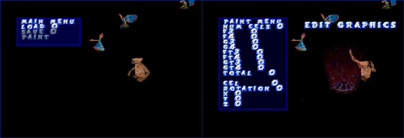 80011714 "EDIT GRAPHICS"Tracing references to them in Ghidra led to the function at 80020678, which gets called if 80077d38 is 0x01. That value is something like “game state” — 0x04 is normal gameplay; 0x06 signals the end of a stage; and 0x07 is “game over.”