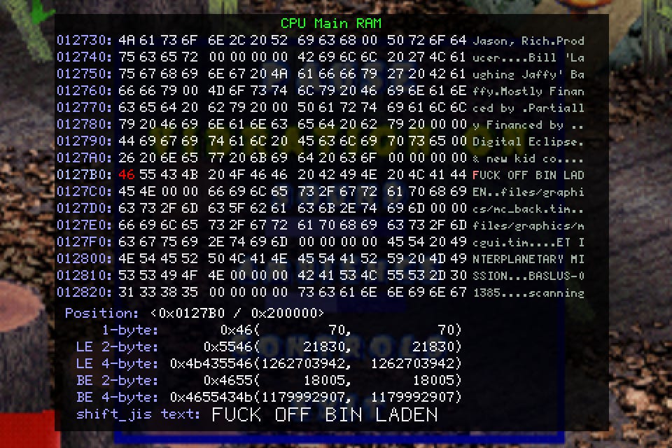 The Bin Laden message is at the end, as shown in the video above. I presume it was put in by Diego “Egg” Link. Or possibly Mark “Beno” Bell? I’d love to know — I reached out to both of them, but didn’t get a response.