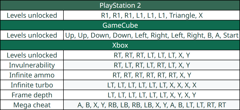 Y, Y, Y, YAnd finally, the best cheat of all. It enables all levels, invulnerability, infinite ammo, and infinite turbo, and displays the message MEGA CHEAT ENABLED. The sequence is: