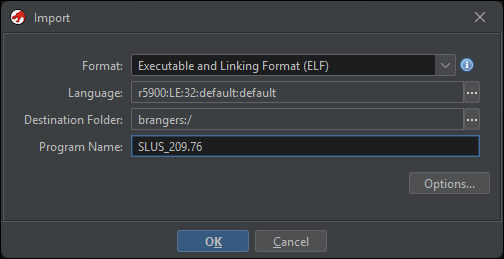 First things first: import something into Ghidra for analysis. I usually use a memory snapshot for this, but it’s fewer steps to use the main game executable instead. On the disc image is a file called SLUS_209.7.