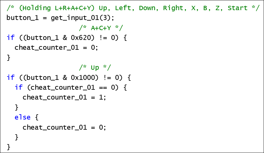 Down, Left, Right, X, B, Z, and Start also increment the counter. Once it hits 7, the function returns 1. This signals that the cheat sequence has been entered successfully.