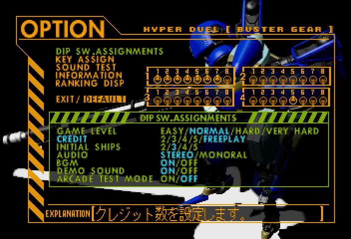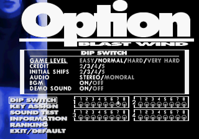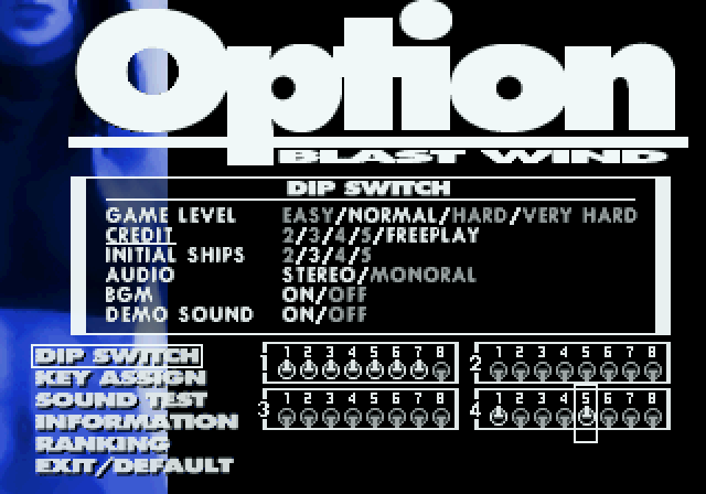 (Holding L+R+A+C+Y) Up, Left, Down, Right, X, B, Z, StartAs in Blast Wind, you’ll get a sound effect if you got it right and the cursor will move into the the fourth bank of DIP switches. Switch #5 also enables Freeplay in this game.