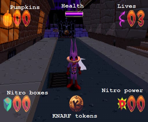 There’s also a lot going on in the game. The HUD keeps track of how much health and how many lives you have. But it also indicates how many pumpkins you’ve collected, how many Nitro boxes you’ve destroyed, how much Nitro power you have, and how many KNARF tokens you’ve picked up: