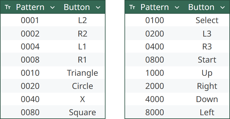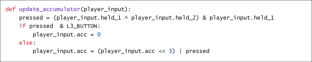 That is, pressing L3 clears the value at our target address. Pressing any other button shifts by 3 bits, then ORs it with a bit pattern that corresponds to the button. Because of that, I called this value acc for accumulator.