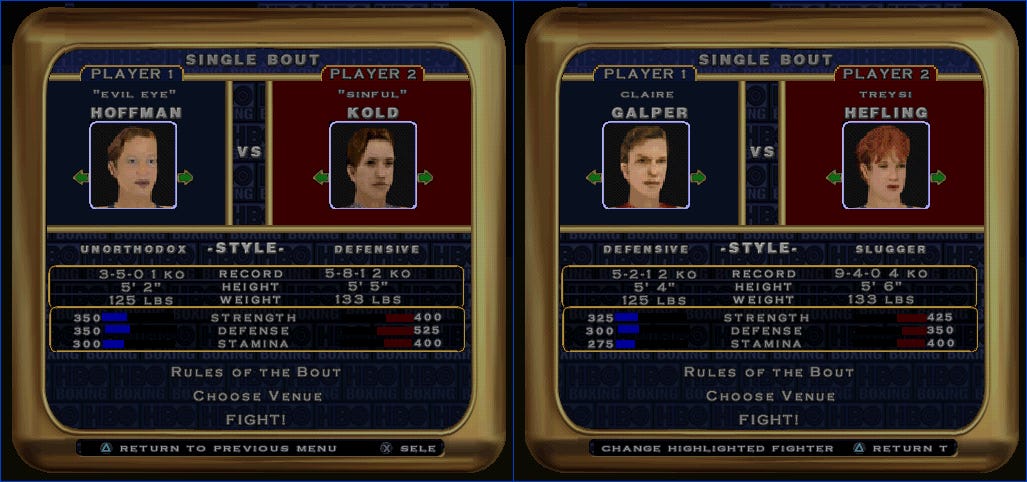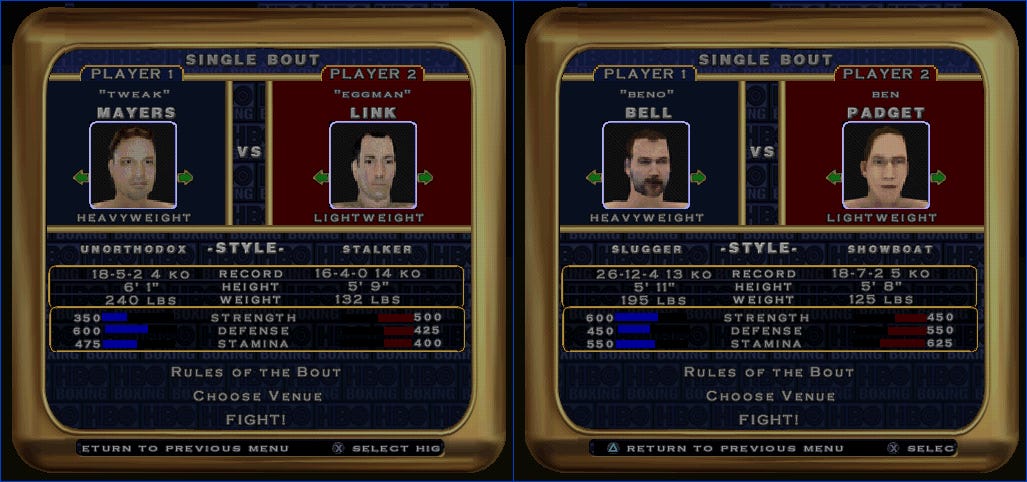 HBO Boxing is another boxing game for PlayStation. This one was published by Acclaim in 2000. GameFAQs mentions that you can “unlock new boxers” by winning in the game’s career mode, but I found a cheat code shortcut.