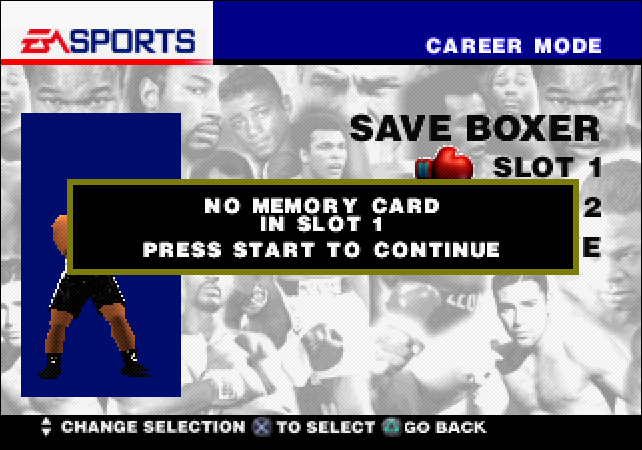 First, start the game with no memory cards inserted. Go to Career and select Create New. Design a boxer to your liking — the parameters you choose don’t matter. When prompted to Keep this boxer, answer Yes and then choose a save slot. You’ll get an error message.