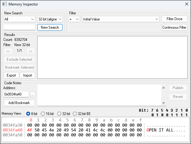 So it’s an “unlock everything” code sequence. That’s cool! But what’s even cooler is what’s going on as you press the buttons: letters start appearing in the buffer at 0034fa40: