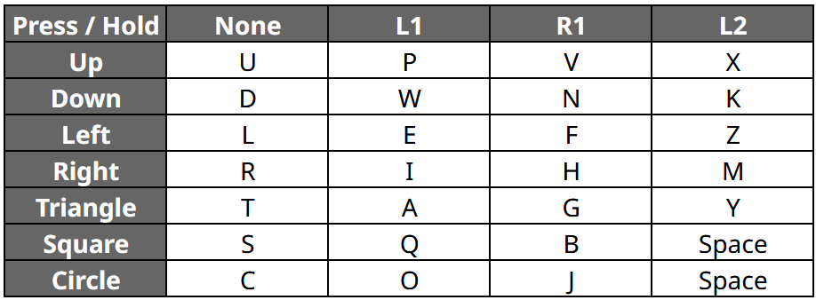 This table shows how to use the controller to enter the letters from A-Z and Space: