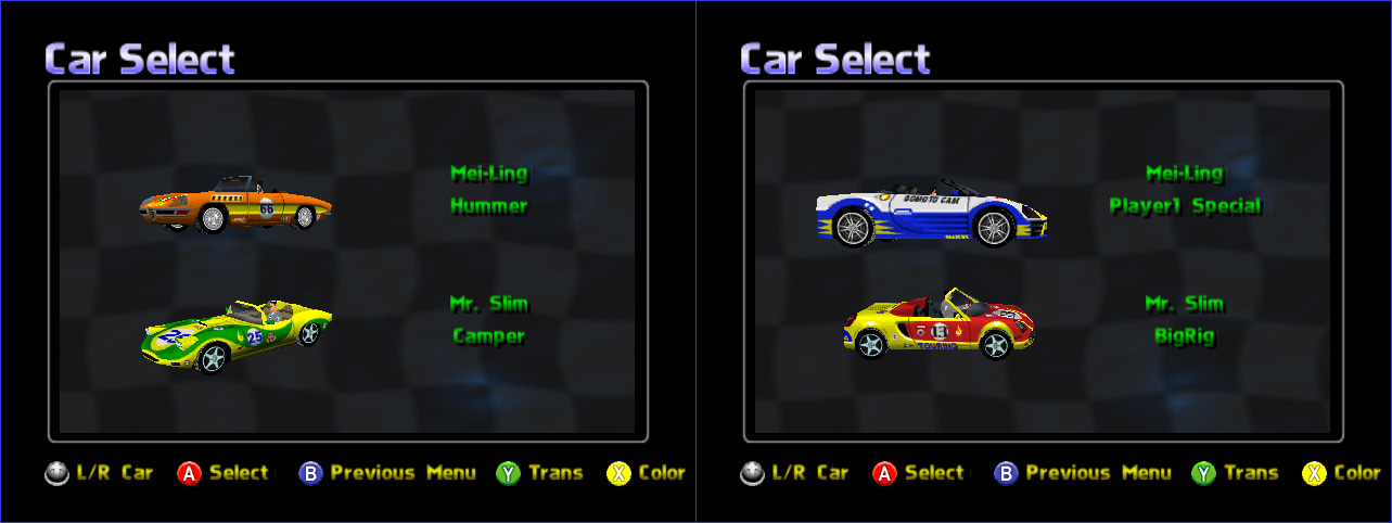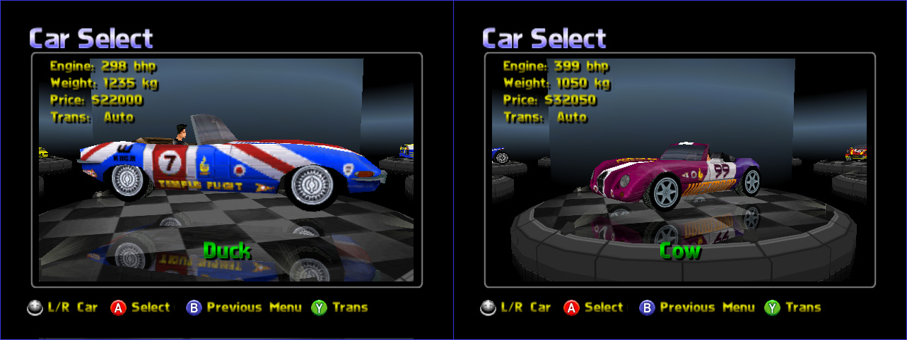 X, Y, X, Y, A, B, X, YThis unlocks several extra cars with goofy names. Here are Duck and Cow:
