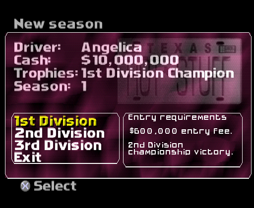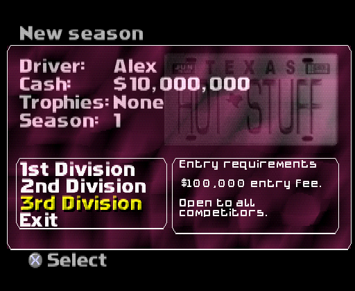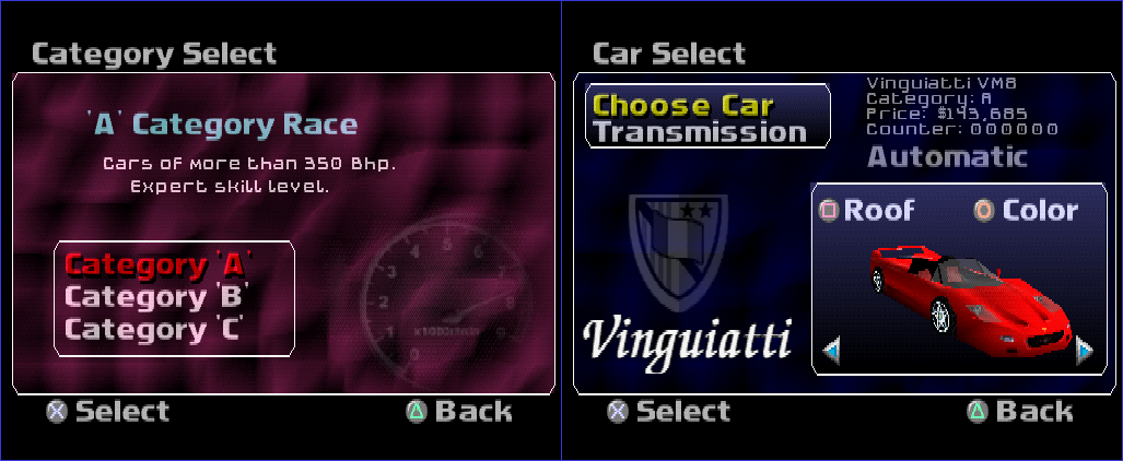 L2, R1, Circle, Square, R2, L1, Square, CircleThis sets the 16-bit values between 800603d0 and 800603d6 from 0 to 1. Those addresses are used to determine whether you can access the Category A and Category B cars – the code unlocks them for you: