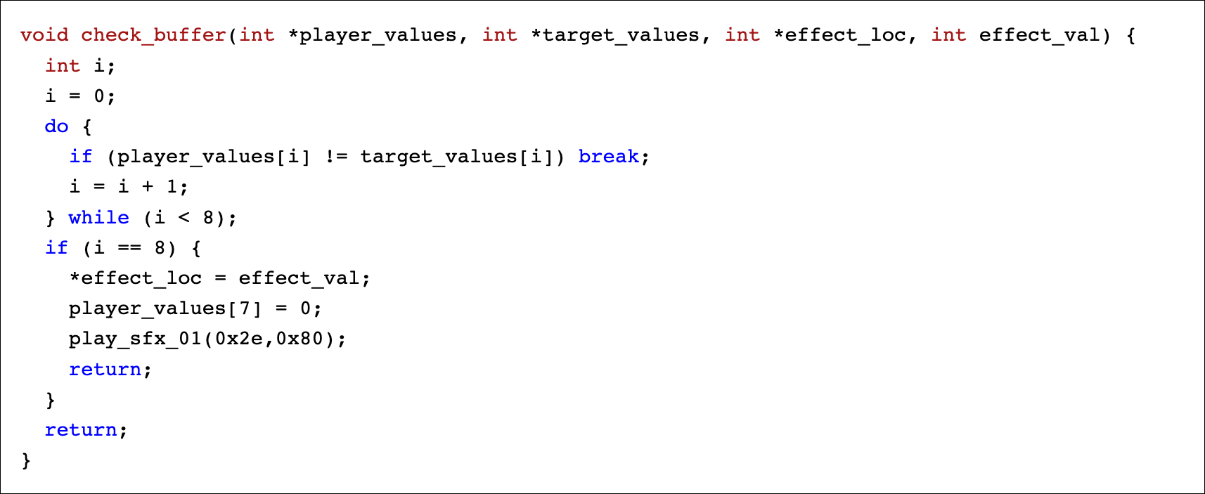Tracing references to the buffer address in Ghidra leads to the function at 8c04e0a4, which compares its contents to an array of fixed values. Here’s Ghidra’s decompilation of that function (with my variable names added):