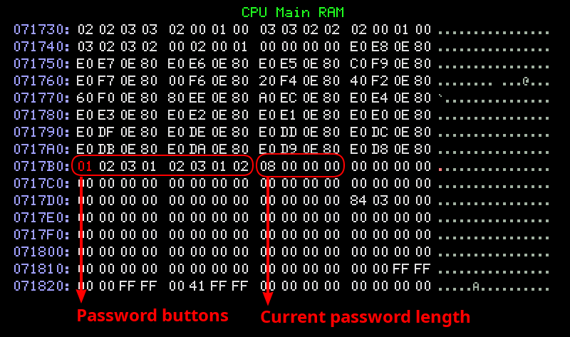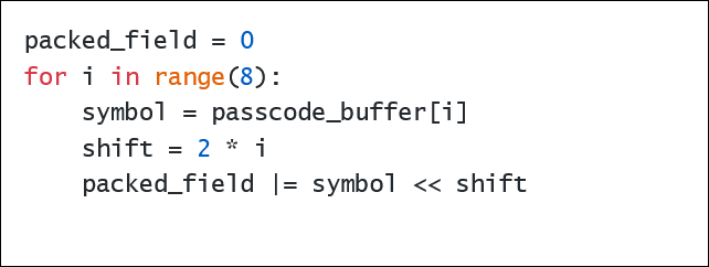 Once you’ve pressed eight buttons, the function at 8005cd28 reads the password buffer. The first thing that function does is pack the button symbol values into a 32-bit field. The logic looks like this pseudo-Python: