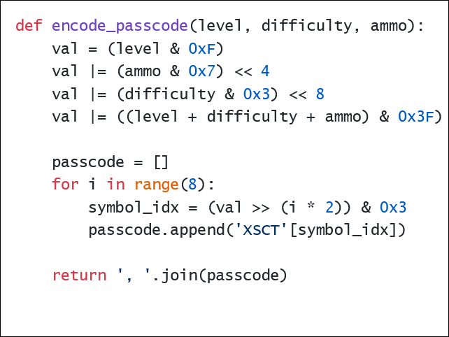 This function will turn a starting level, difficulty setting, and ammunition value into a valid passcode: