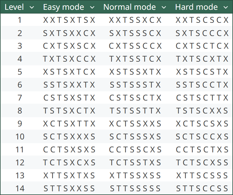 The cheat sites (e.g., GameFAQs, IGN) have various passwords listed for this game. But they all seem to be for the Normal difficulty level, and so aren’t comprehensive. I ran the function above in a loop to generate the full set of level passwords: