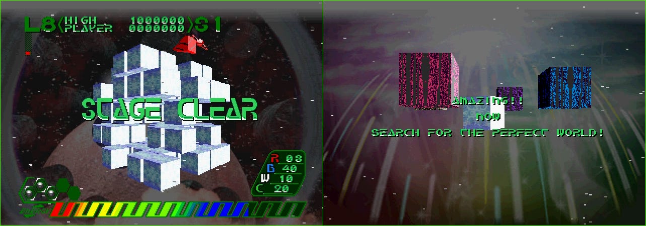 Sound Qube is a puzzle game from Media Entertainment and Human Entertainment. There’s a very thorough description of the gameplay at Sega Retro, but in a nutshell: You’re presented with a cube-like figure that’s made up of smaller cubes. You use “sonar” to sonar to eliminate groups of sub-cubes, based on their color.