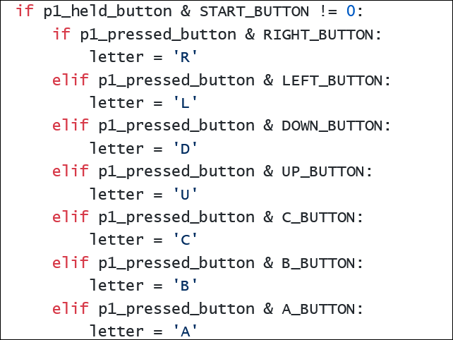 The function then saves the letter to the buffer starting at 060424e8 and then compares that buffer to the strings above. On the Pause screen it checks the first two strings; on the Option screen it targets the third one.