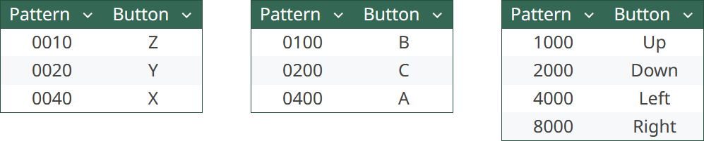 The sequences use a mapping of bit patterns to buttons that’s standard for Saturn: