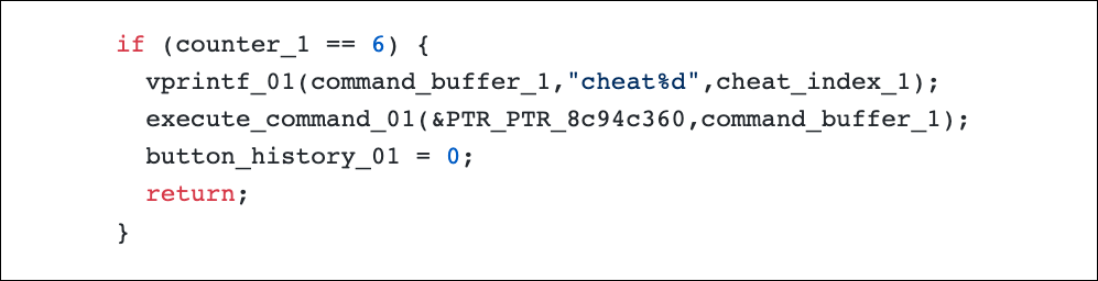 The execute_command_01 call interprets these command strings based on the current game context. The codes above can be entered any time, but they’ll be ignored if you’re not on the pause screen.
