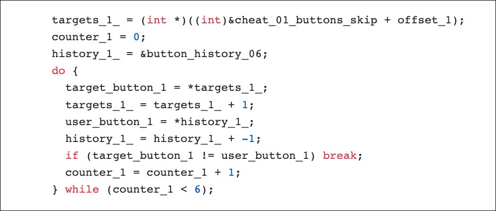 Tracing writes to that address in Ghidra led me to the function at 8c188ca0. Let’s look at the first part of its logic, which handles storing your most recent six button presses. I’ve added labels to Ghidra’s decompilation: