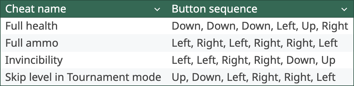 The Dreamcast edition has four well-known cheat codes. Each one is entered on the Pause screen: